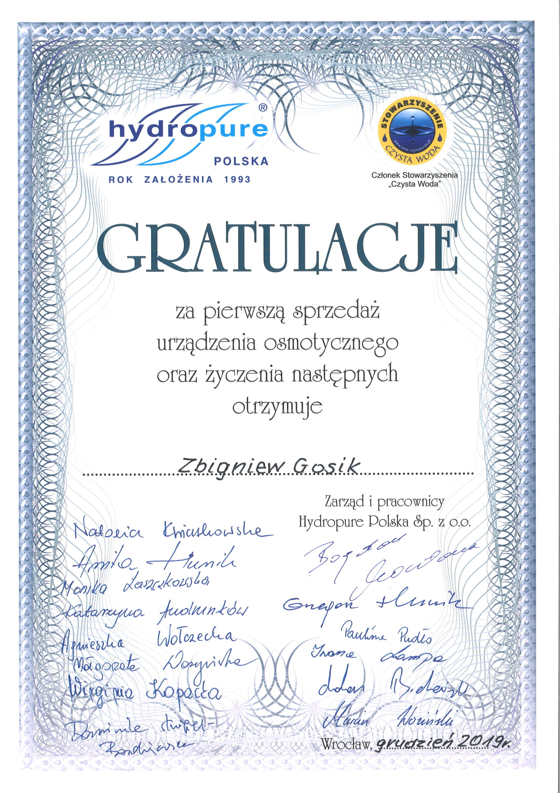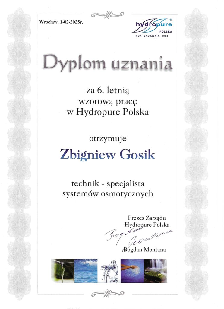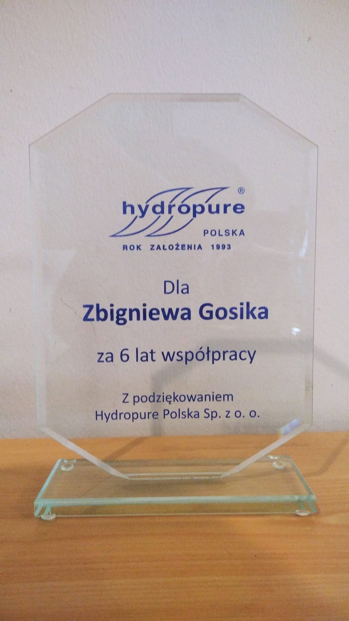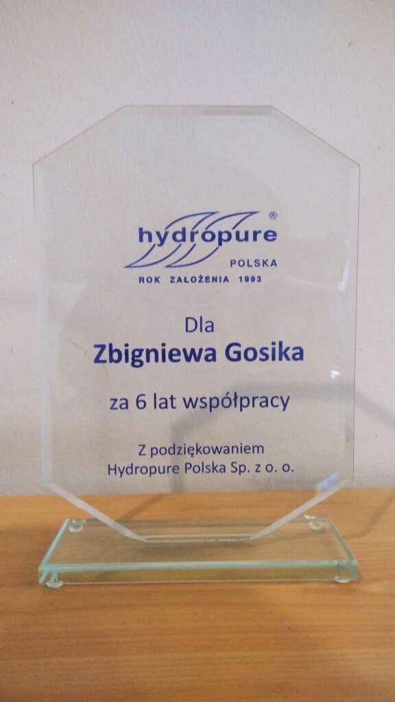 Od ponad 6 lat jestem przedstawicielem firmy HYDROPURE POLSKA. Firma ta jako pierwsza w Polsce zajęła się tematyką oczyszczania wody metodą odwróconej osmozy (od roku 1993) i do dziś jest niekwestionowanym liderem w tej branży. Również jako jedyna w kraju oferuje bezpłatny montaż swoich urządzeń na obszarze całego kraju oraz wieczystą gwarancję na swoje urządzenia (bezpłatne naprawy przez wykwalifikowanego serwisanta w domu klienta).